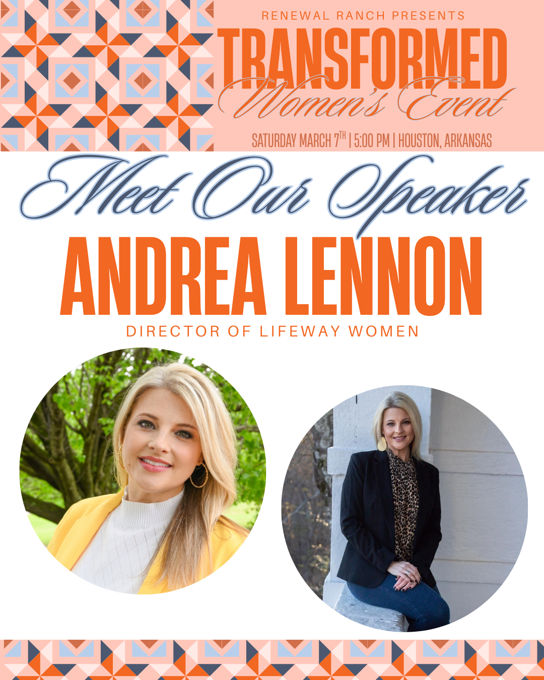 Andrea Lennon serves as the Director of Lifeway Women. She is a Bible teacher whose life calling is to teach women to know the truth, live the truth, and share the truth. Her passion is honest conversation about the topics that drive our everyday lives, and how we can always weather the storms of life through the love and power of God and His Word. Andrea is a 2004 graduate of Southwestern Baptist Theological Seminary. She lives in Arkansas with her husband, Jay. They are thankful for two amazing sons, two beautiful daughters-in-law, and one very chill dog.Join us for a transformative evening of inspiration, connection, and celebration at Transformed, a special women’s fellowship event hosted by Renewal Ranch. On Saturday, March 7th from 5:00 to 7:00 PM, come experience a night designed to uplift and empower women through: