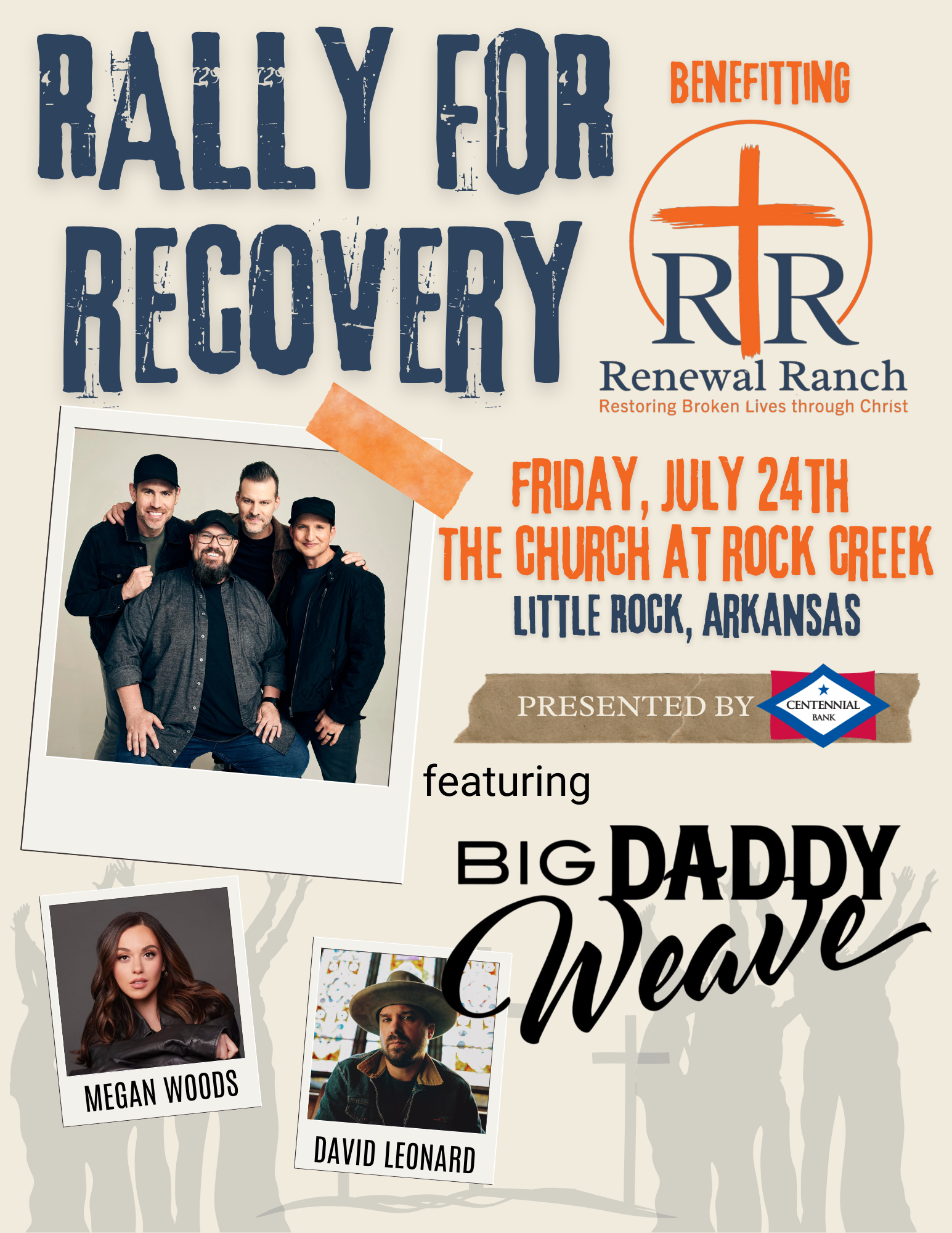 On Friday, July 24th Renewal Ranch and Centennial Bank are excited to announce the 12th Anniversary of the Rally for Recovery with special guests Big Daddy Weave, Megan Woods, and David Leonard